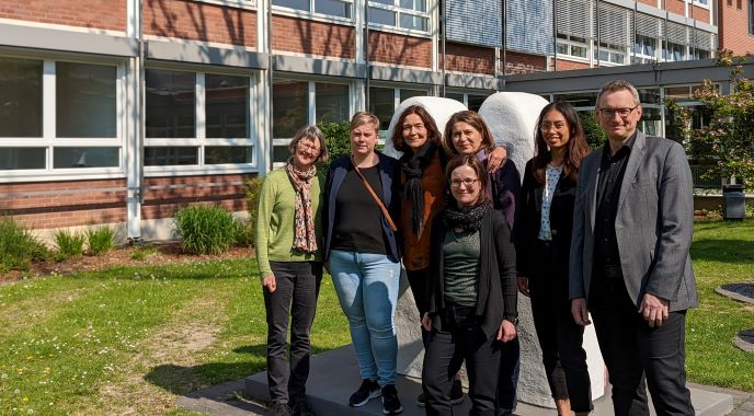 Foto: Die Gäste aus Norwegen gemeinsam mit EvH-Prorektorin Prof. Dr. Cinur Ghaderi, Prof. Dr. Andrea Kuhlmann und Prof. Dr. Roland Schöttler (für das Projekt AIDA) sowie Karen Bossow.