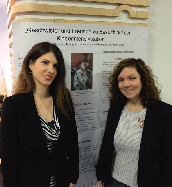 „Sowohl bei Ärzten, als auch beim Pflegepersonal: Angehörige gelten eher als Störfaktor“, moniert EvH-Studentin Katharina Biernath (Foto, r.), die an einem großen Klinikum im Ruhrgebiet als Fachkinderkrankenschwester arbeitet. Auf eine Schwester/einen Pfleger kämen bis zu vier Patienten. Da gelte es, Maschinen und Medikamentation zu überwachen, den Telefondienst auf der Station zu versehen. Für tröstende, mitunter aufreibende Gespräche fehlten schlicht Zeit, Kraft und Motivation.