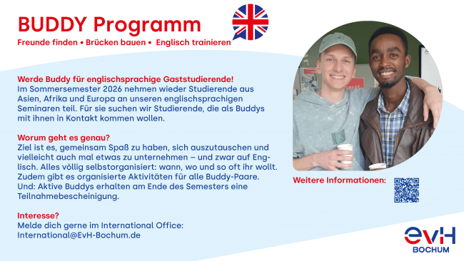 Jedes Sommersemester kommen Studierende ausländischer Partnerhochschulen an die EvH Bochum, die meist keine Deutschkenntnisse haben. Um ihnen den Einstieg in Bochum und ihr Studium an der EvH zu erleichtern, suchen wir EvH-Studierende mit englischen Sprachkenntnissen, die als „Buddys“ Lust haben, etwas Zeit mit den Austauschstudierenden zu verbringen. Dabei können sie ihr Englisch trainieren, interessante Menschen kennenlernen und ganz nebenbei auch noch Einblicke in das Studium in anderen Ländern erhalten.