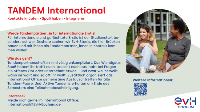 Im Programm TANDEM International bringen wir Geflüchtete und andere internationale Studieneinsteiger_innen mit EvH-Studierenden zusammen. Die Neuzugewanderten erhalten Kontakt zu anderen Studierenden, trainieren ihre Deutschkenntnisse und erhalten einen besseren Einblick in das Studium an der EvH Bochum – und die EvH-Studierenden erweitern ihren Horizont und lernen Menschen aus anderen Kulturen kennen. Ein Gewinn für beide Seiten.
