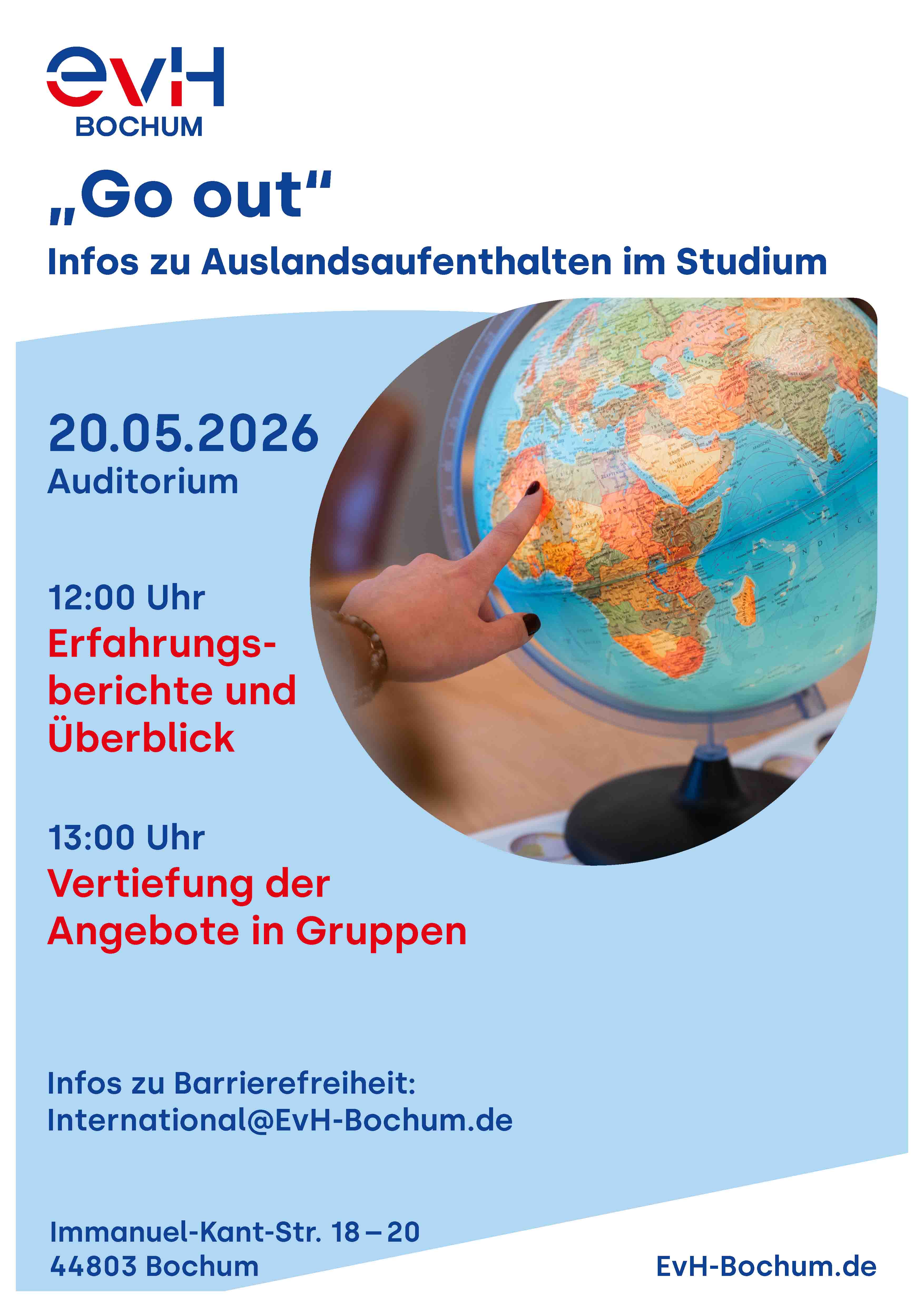 Ob Praktikum oder Studiensemester: Wer ins Ausland geht, profitiert davon und dammelt wichtige interkulturelle Erfahrungen. Wir möchten Sie ermutigen, Auslandsaufenthalte zu planen. Aber wie geht das? Die Veranstaltung „Go out“ beantwortet interessierten Studierenden der EvH Bochum alle Fragen rund um den Auslandsaufenthalt.