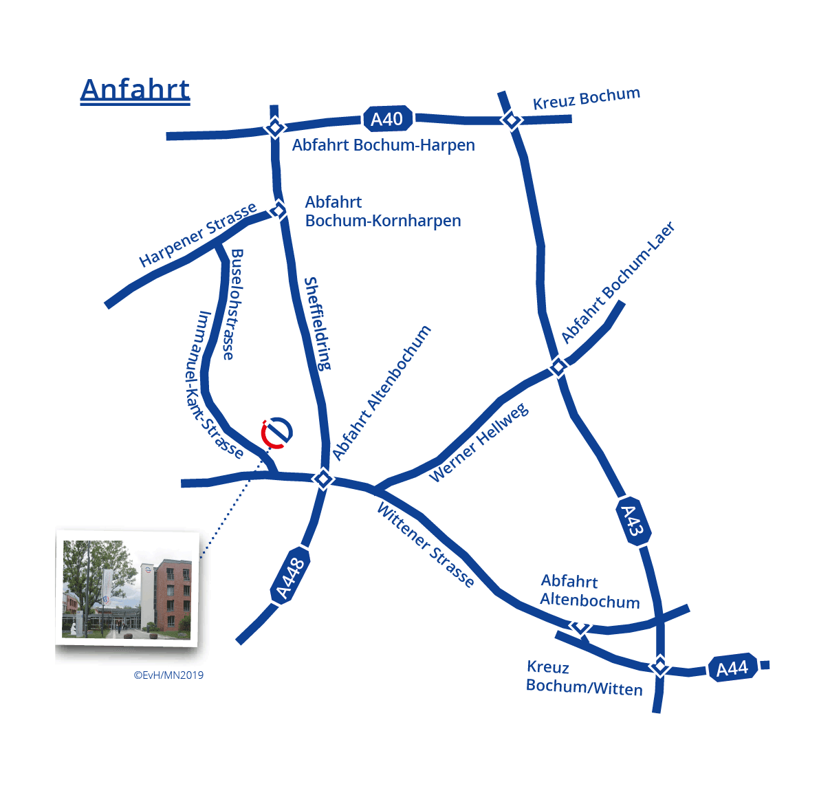 Die Immanuel-Kant-Straße ist eine Seitenstraße der Wittener Straße im Stadtteil Altenbochum. Die Wittener Straße führt unmittelbar in das Stadtzentrum (Hauptbahnhof) und in entgegengesetzter Richtung zum Autobahnkreuz Bochum/Witten. Vom Hauptbahnhof ist die EvH in ca. 15 Min. zu erreichen mit den Straßenbahnlinien Nr. 302 (Richtung Bochum-Laer) und Nr. 310 (Richtung Witten-Heven) oder der Buslinie Nr. 345 (Richtung Bochum-Langendreer). Ausstieg an der Haltestelle "Mettestraße" an der Wittener Straße; die Evangelische Hochschule ist dort ausgeschildert.